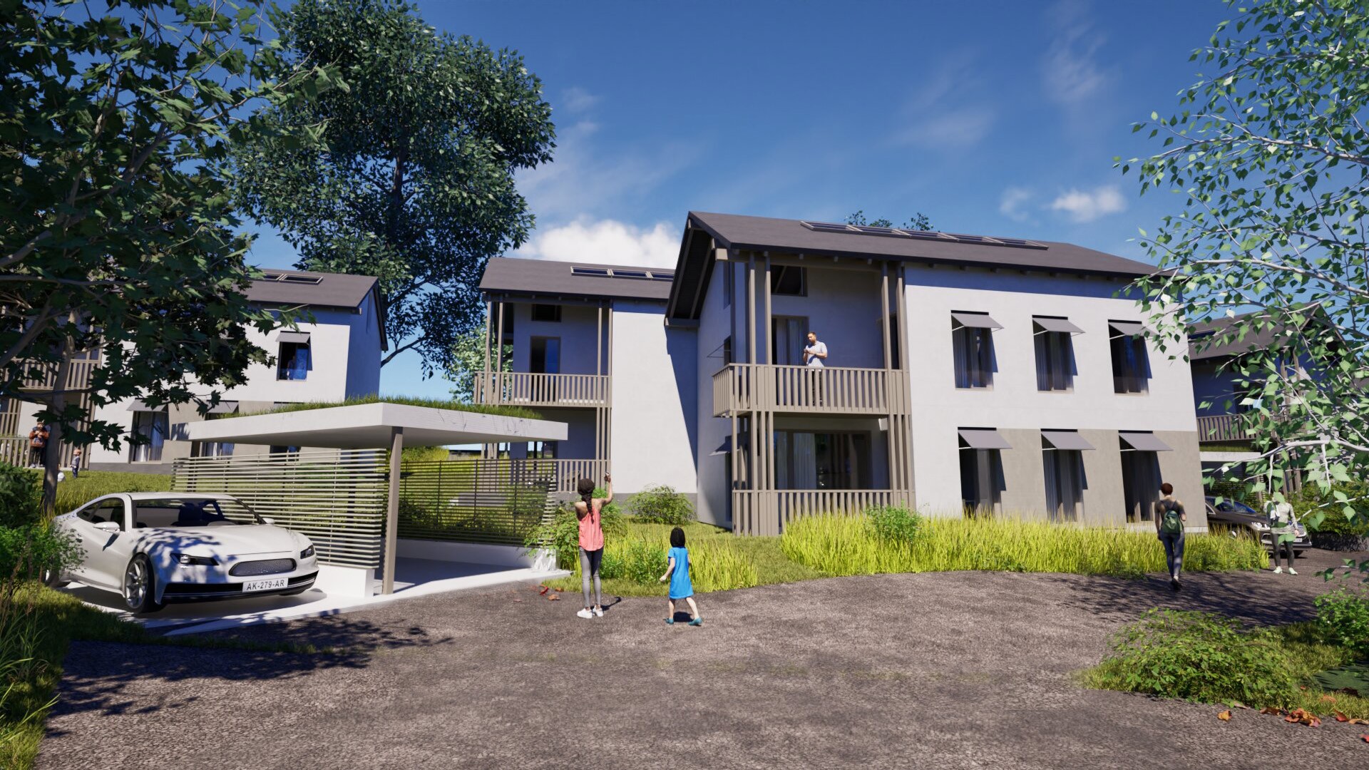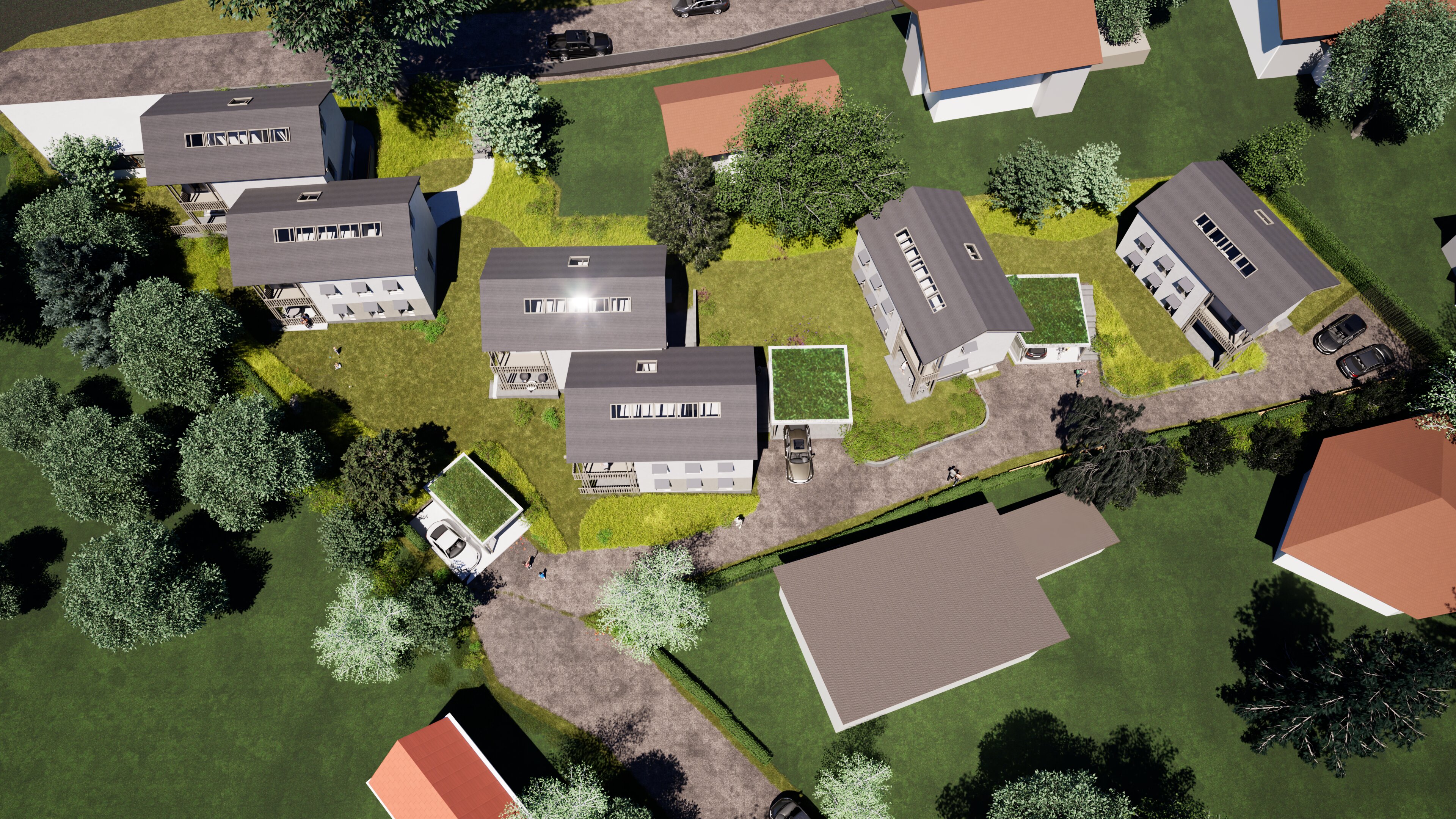 Alle Häuser werden klimafreundlich über Luft-Wärmepumpen beheizt; zwei Stellplätze pro Haus sind inklusive und bereits für Wallboxen vorbereitet.